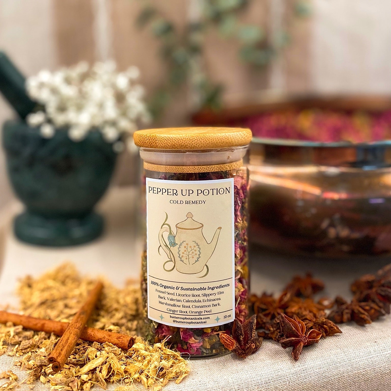 Chase away the chill with this Pepper Up Potion. Let its aromatic steams and rich flavors transport you to a place of comfort. With each soothing sip, feel the warming power of nature's healing herbs while they embrace the organs with their healing touches as you say goodbye to the cold with a cup of liquid comfort.